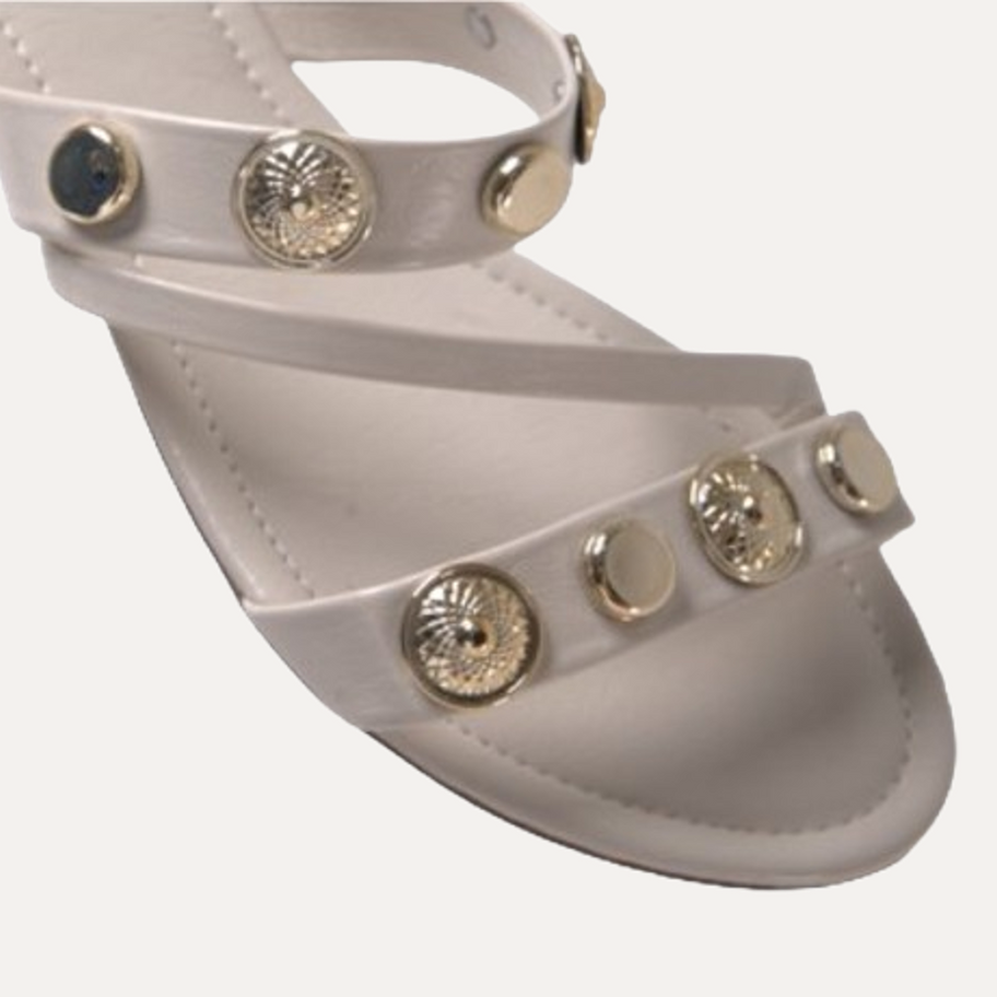 Rasteirinha conforto, leve, com tiras e medalhas decorativas. Salto bloco de 1,5cm.